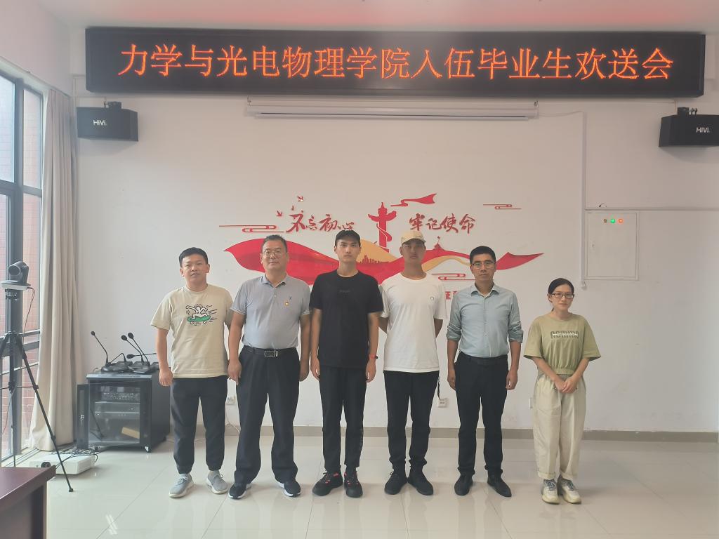 孙东升代表学院向即将奔赴军营的学子们表达了母校的祝福,并提出希望:一是要珍惜荣誉,牢记使命;二是要不畏艰难,磨砺意志;三是要严守纪律,服从指挥;四是要建功军营,为学校争光。2名入伍学生在即将踏入军营之际,表达了自己的感想,他们表示感谢学校、学院的关心和厚爱,感谢老师、父母的辛勤培养。今后定将不忘初心,牢记嘱托,在军营里锤炼过硬本领,为强军兴军贡献力量,绝不辜负党和人民的期望。