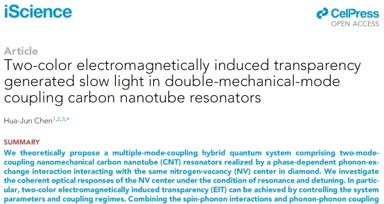 近期,我中心教师陈华俊以唯一作者身份在Cell子刊iScience发表题为《Two-color electromagnetically induced transparency generated slow light in doublemechanical- mode coupling carbon nanotube resonators》的论文,色情视频