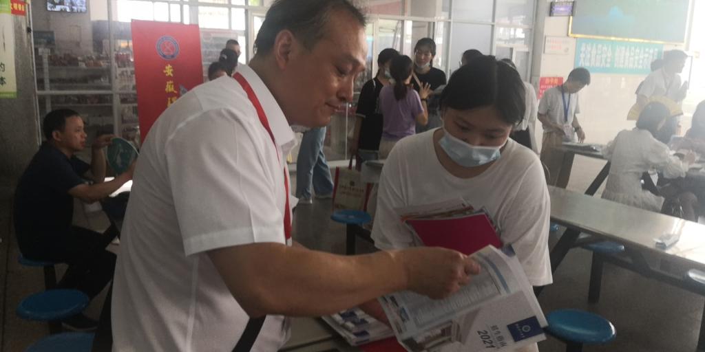 负责蚌埠市及周边县共11所省级示范高中的招生宣传工作,6月16日学院根据学校招生的相关要求召开院务会对招生宣传工作做了动员。6月19日上午学校召开了2021年本科招生宣传工作专题培训会后,学院党委立即召开招生宣传工作部署会,详细研究了这11所中学的历史、领导班子及学校特色等基本信息,并结合我校近几年在这些中学的招生情况,动用学院在蚌埠市的一切可能的人脉关系,制定了详细的工作计划。生源大户的中学是我们工作的重点,要巩固和加强;对于往年招生数较少中学采取加强宣传,争取逐步成燎原之势;另外我们的宣传不仅仅是学校给出的省级示范高中,对于一些生源较好私立中学更是我们积极争取的对象。学院根据实际情况,分成了四个工作组,分别负责相应的中学宣传工作。学院建立招生群,招生人员统一着装,佩戴校徽及工作牌。制作了水牌及横幅,并将可能用到的材料打印出来装订成册,并搜集了考生及家长可能咨询的问题。从6月20日开始,学院班子四次进入蚌埠市和相关教育主管部门及中学校长们进行了对接,约定了进校宣传时间及方式,为后面的顺利宣传铺平了道路。